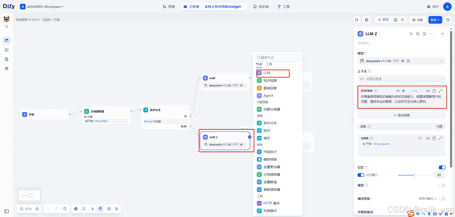 7.如果没有文件上传,添加一个LLM2节点直接回答用户的问题,SYSTEM中添加描述(根据实际情况描述):