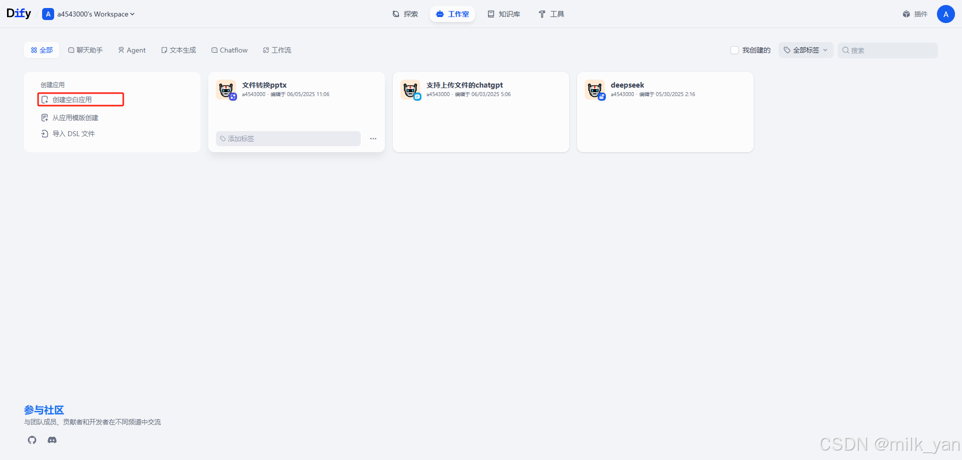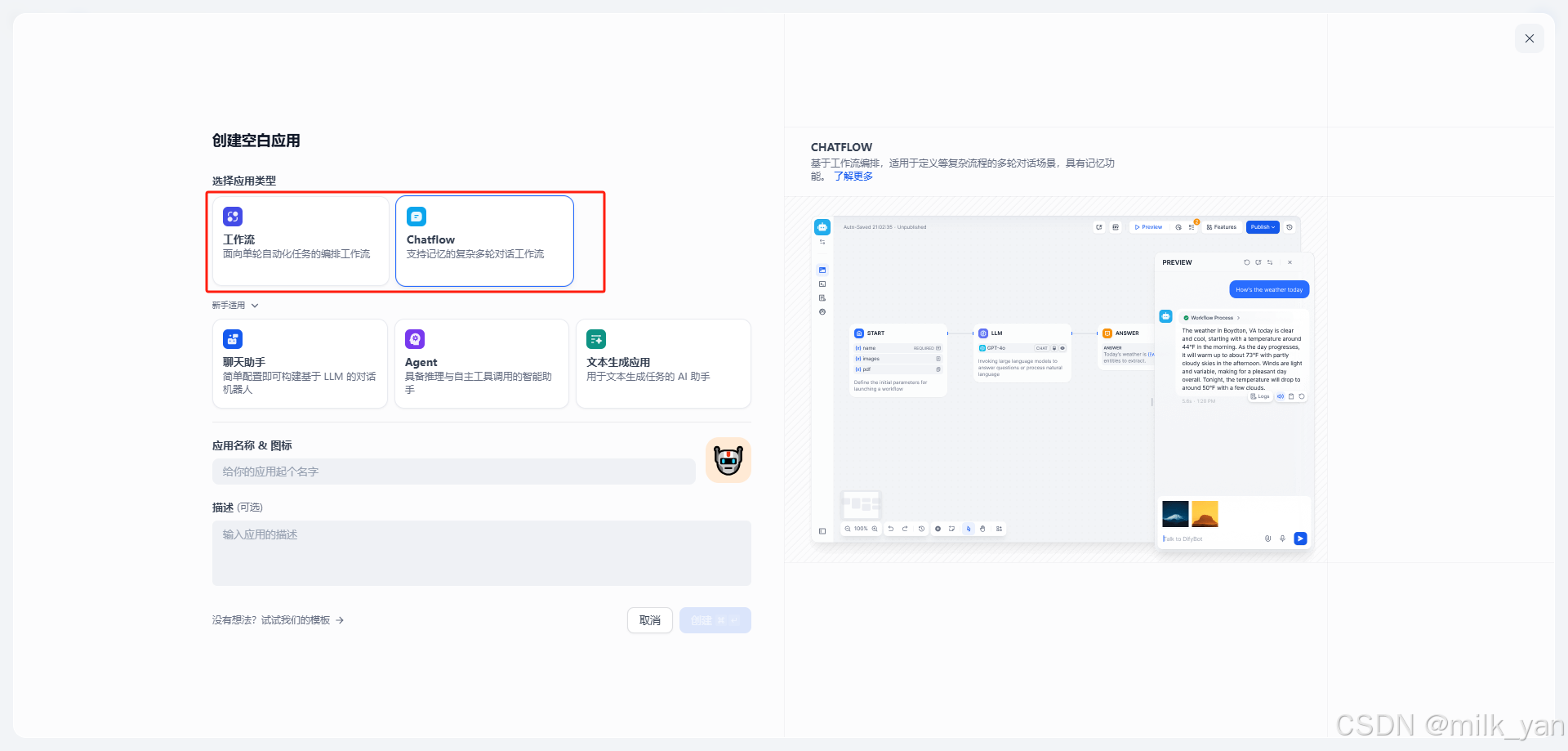 2.选择ChatFlow 或 Workflow ,我这里使用的是ChatFlow :