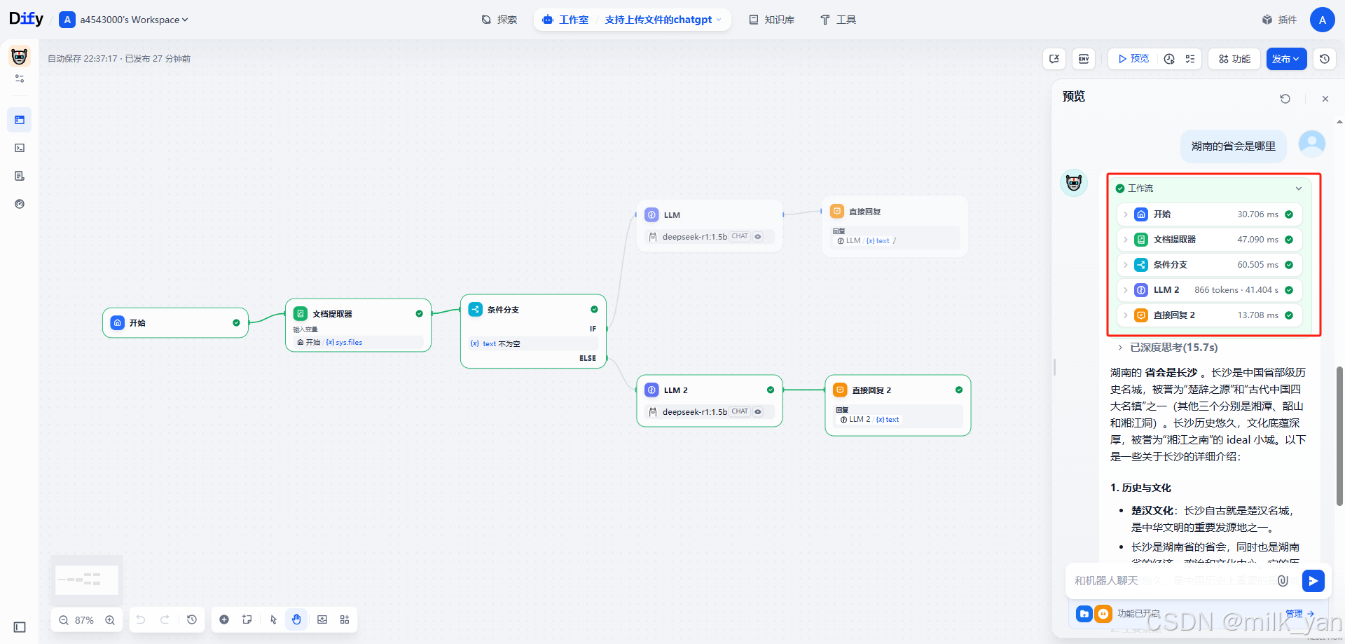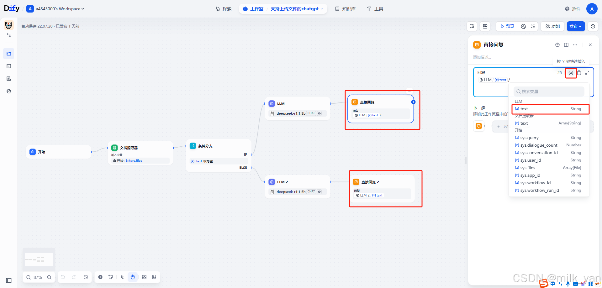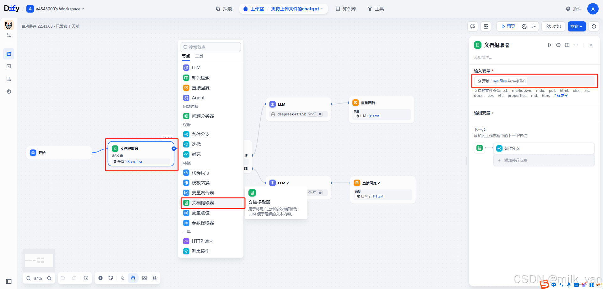 4.由于本地部署的DeepSeek不能直接解析文件,还需要添加一个文档提取器,把文件中的内容提取出来。