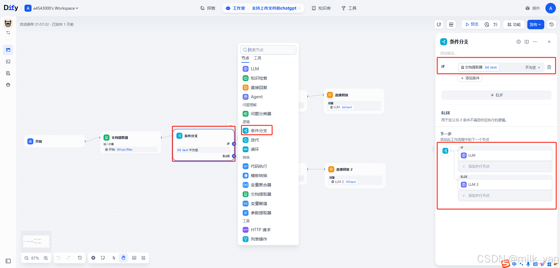 5.添加一个条件分支,判断用户有没有上传文件,如果上传了文件就引用文件的内容来回答问题,如果没上传文件就直接回答用户的问题。