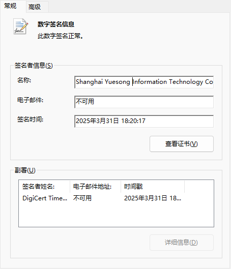 - 数字签名:通过弹窗定位能查看到相同的运行文件,找到其中的文件定位以及数字签名,会显示签名公司(如“Shanghai Yuesong Information Technology Co., Ltd.”),这正是流氓软件的来源。