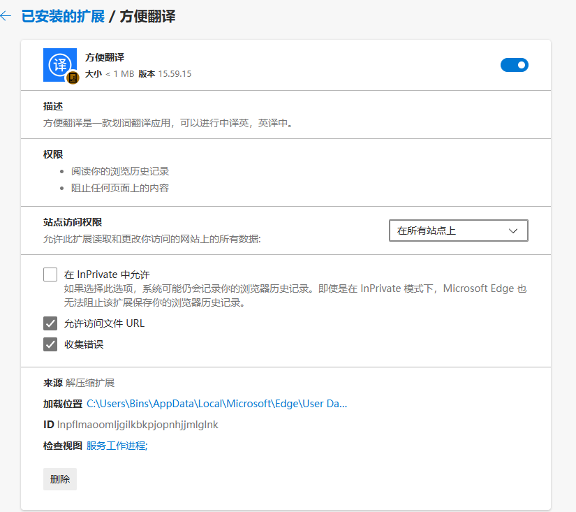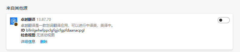 - 插件名(通过edge浏览器找到的,也可以通过软件附赠的弹窗定位软件能看到这个在运行):方便翻译、卓越翻译,其中id就是它的文件名字