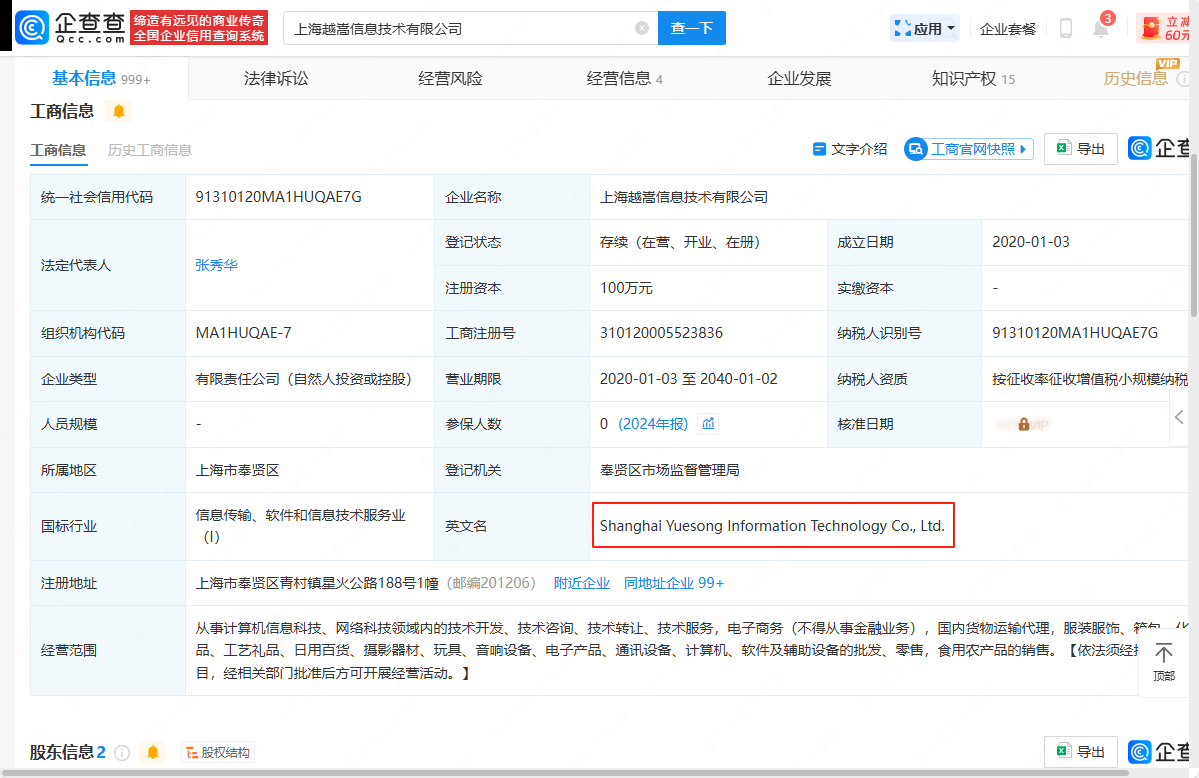 能查找到“上海越嵩信息技术有限公司”这个公司(企查查中)