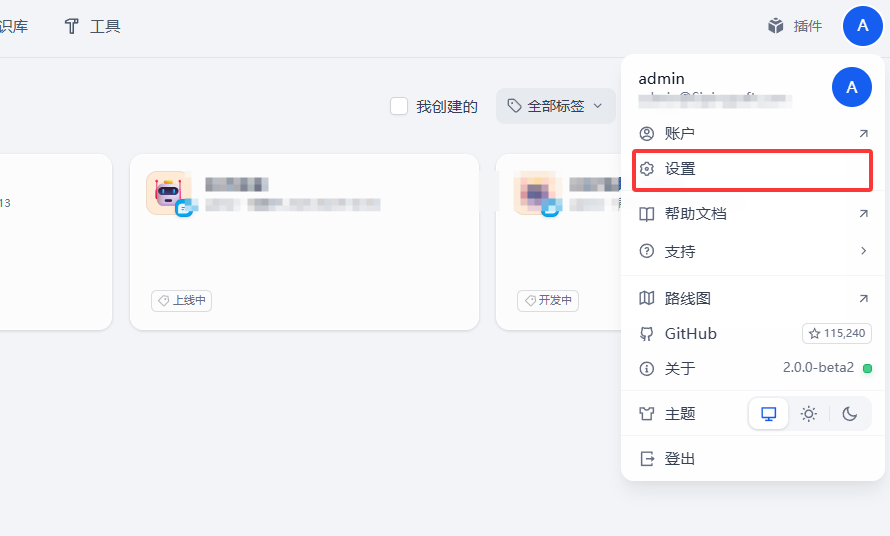 先登录管理员账户,(登录网址一般是部署dify的服务器的ip地址,端口默认80端口,如http://xxxx:80),然后点击右上角的头像,选择设置