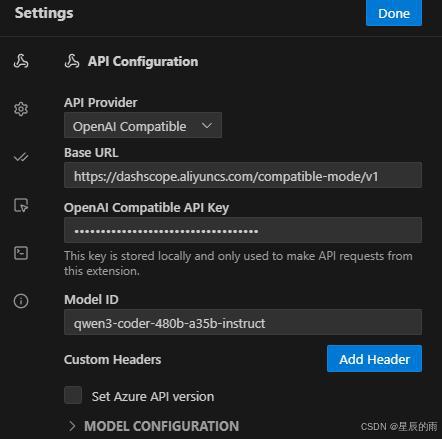 2、打开Cline在设置里面API Provider选择OpenAI Compatible,Base URL输入框填写:https://dashscope.aliyuncs.com/compatible-mode/v1,API KEY输入框里填写你在阿里云百炼申请的API KEY,Model ID输入:qwen3-coder-480b-a35b-instruct,最后点击DONE。