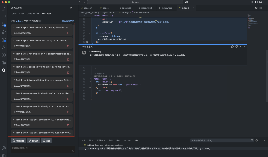 单元测试生成 :CodeBuddy 支持一键生成高质量单测,覆盖边界条件与异常路径,把 Bug 拦截在提交之前。从此告别“上线即修 Bug”的噩梦。