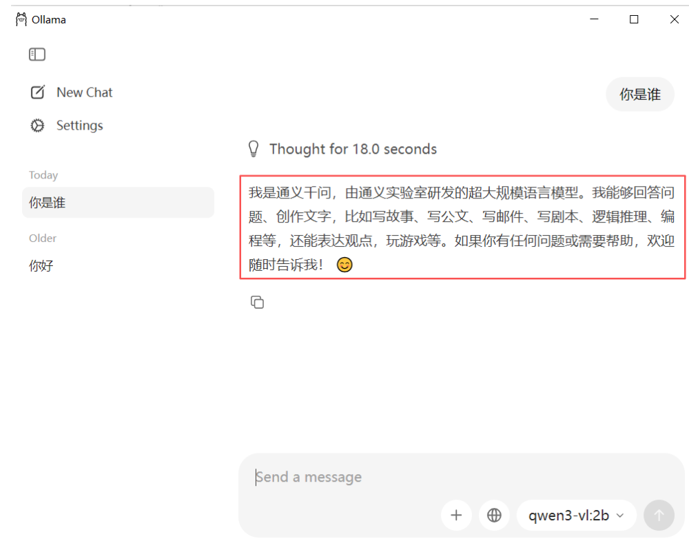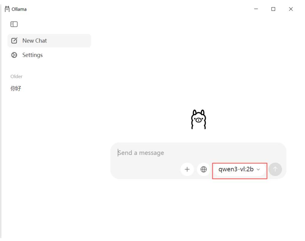 我们在聊天窗口的右下角选择刚刚安装成功的qwen3-vl:2b大模型。