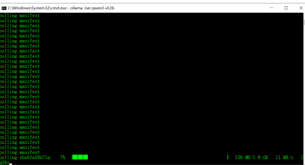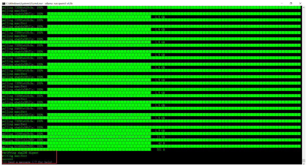 我们运行ollama run qwen3-vl:2b安装Qwen3-VL大模型