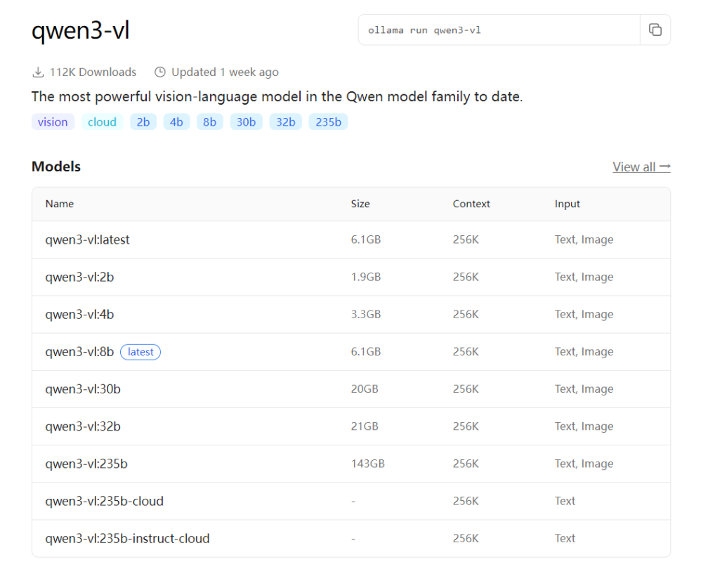 Ollama上的Qwen3-VL地址:https://ollama.com/library/qwen3-vl