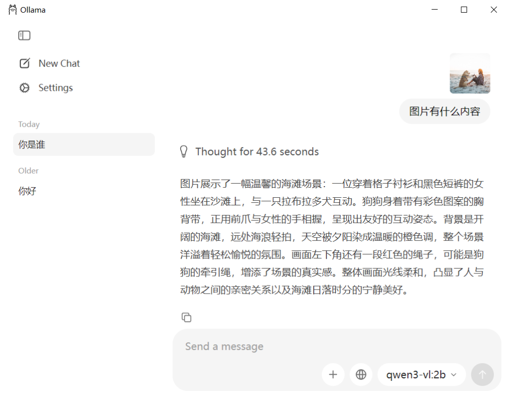 可见,2b大小的模型完成了对图片的理解,但大概花了43秒,后续将介绍如何调用Ollama 云端的Qwen3-VL大模型进行图片理解。