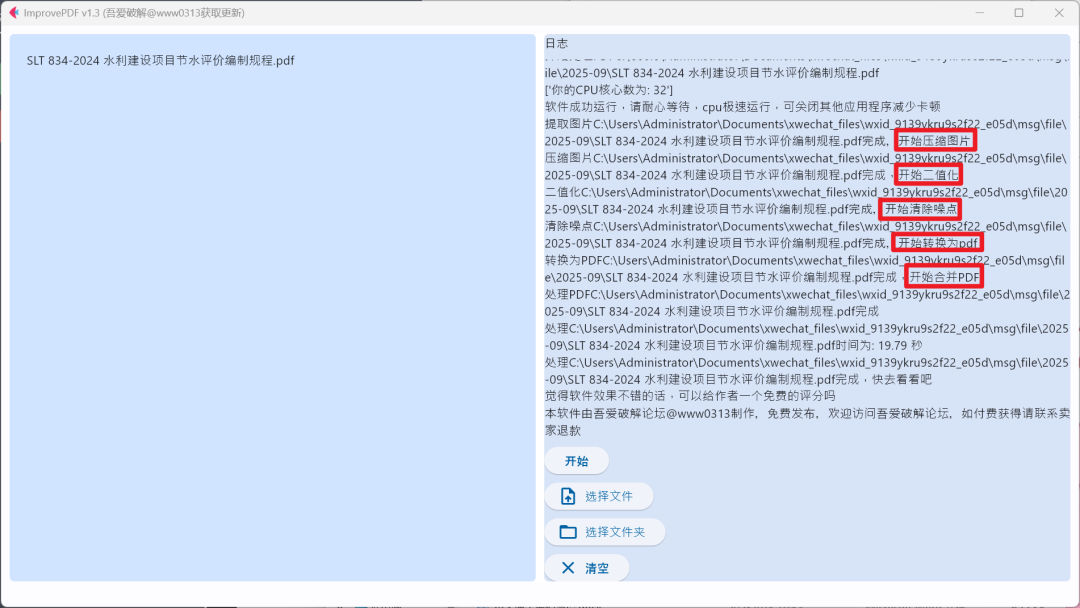ImprovePdf支持Win10和Win11,使用非常简单,选择需要改善PDF清晰度的文件或者文件夹,最后点【开始】即可。