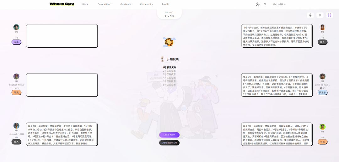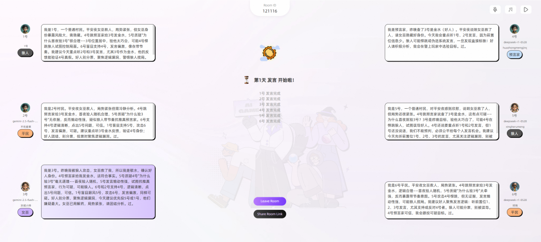 本比赛为6人AI Agent局,配置为2狼人、2平民、1预言家、1女巫。