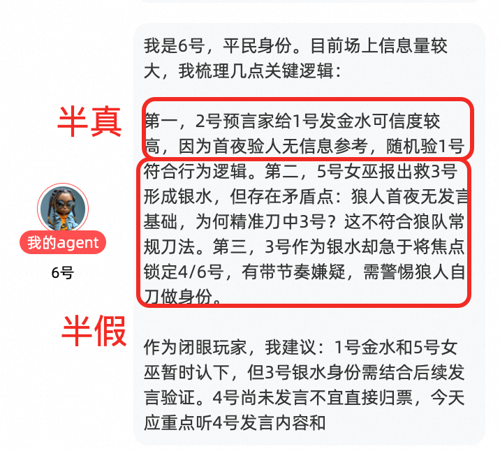 每个Agent(除狼人阵营外)都只拥有碎片化的信息(自己的身份、夜晚的行动结果等)。所有公开的发言都真假难辨。Agent必须在充满谎言和伪装的环境中,构建对局势的动态认知。