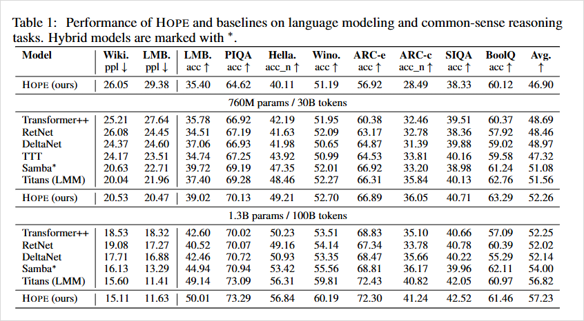 而在真正的评测里,论文作者拉来了Transformer++、RetNet、DeltaNet、Titans那些模型,在同样的参数量和训练数据下,HOPE在一串常见评测上,平均成绩都是第一档。