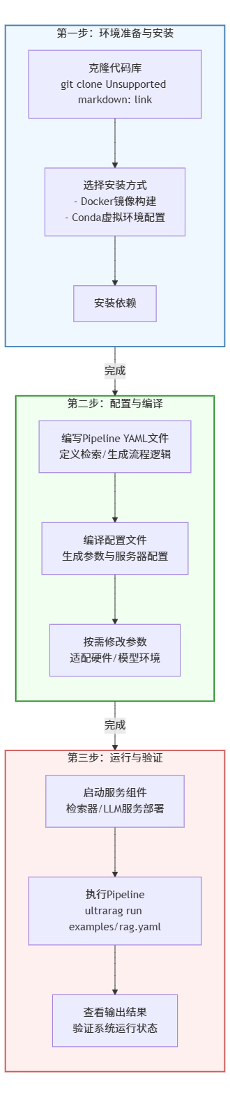 # 创建虚拟环境conda create -n ultrarag python=3.11conda activate ultrarag# 克隆仓库git clone https://github.com/OpenBMB/UltraRAG.git --depth 1cd UltraRAG# 安装依赖pip install uvuv pip install -e ".[all]"
