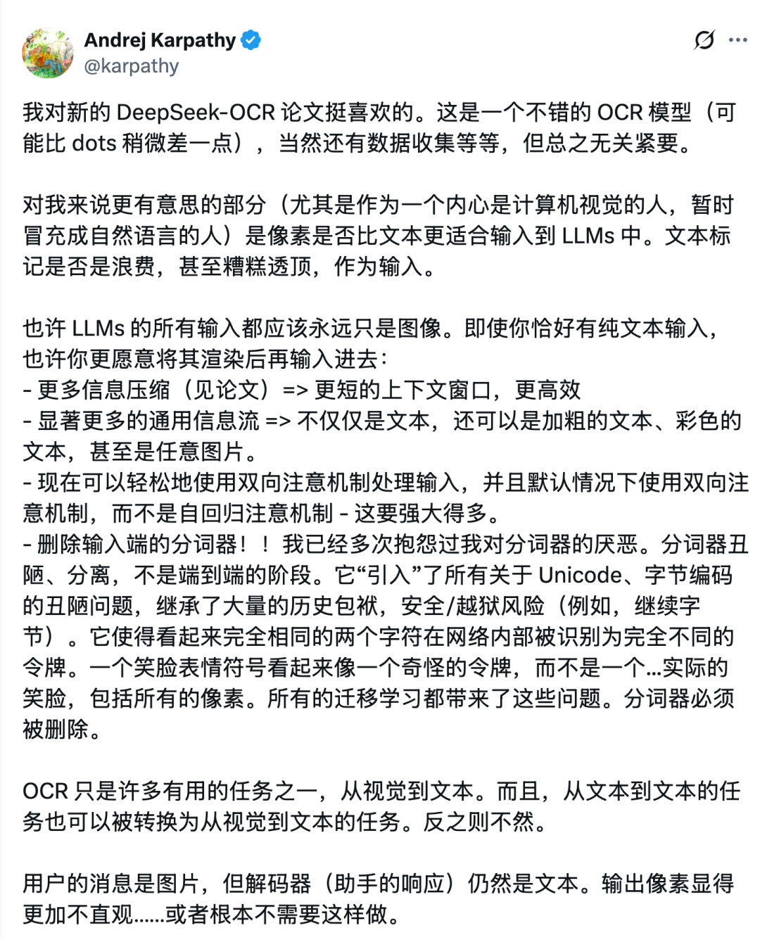 Andrej Jarpathy 也给予 DeepSeek-OCR 极高评价