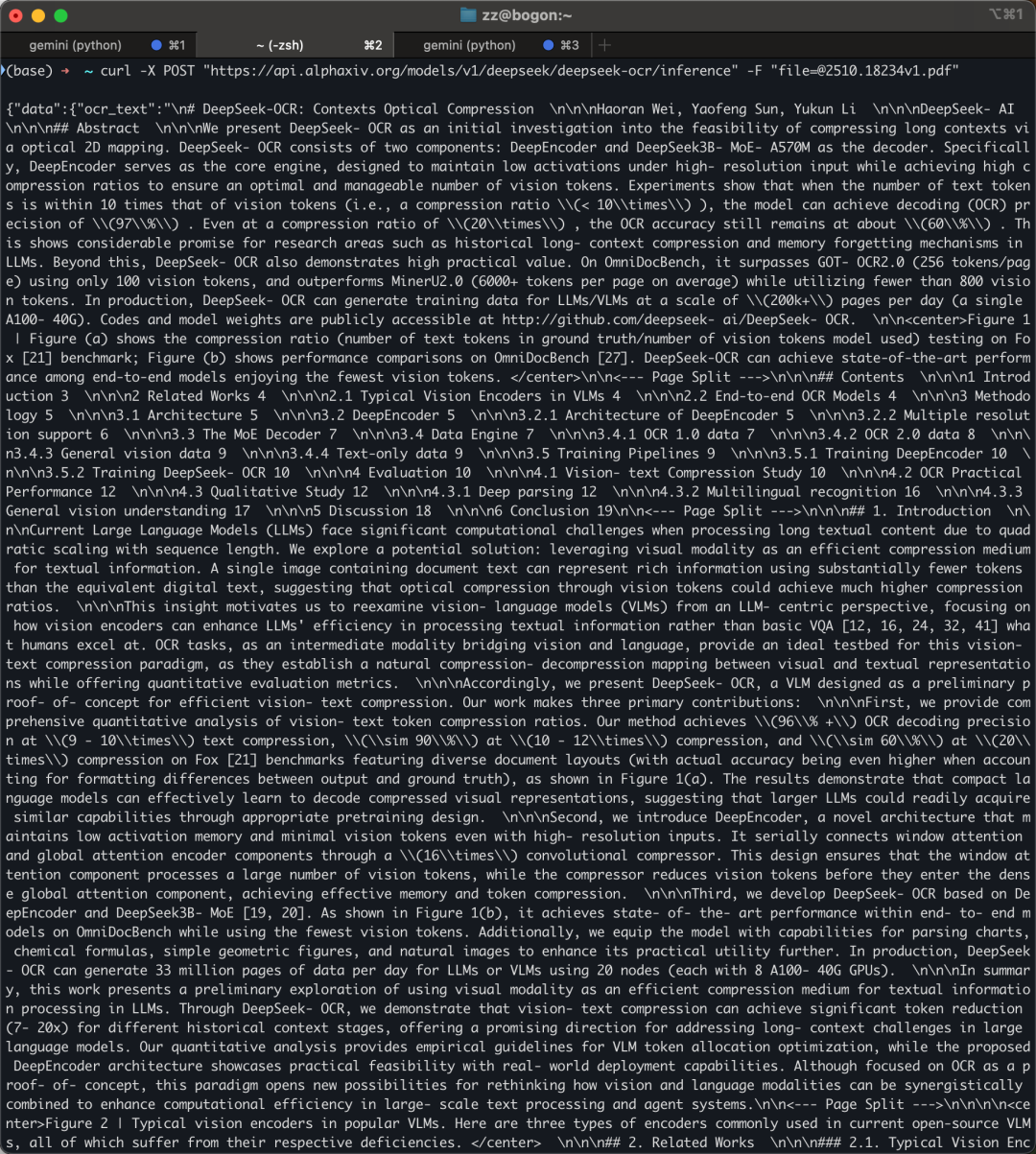 此外,我还测试了论文阅读已死,alphaXiv 新功能,彻底颠覆科研工作流一文中提到的 API,调用 DeepSeek-OCR 把 PDF 转 Markdown。