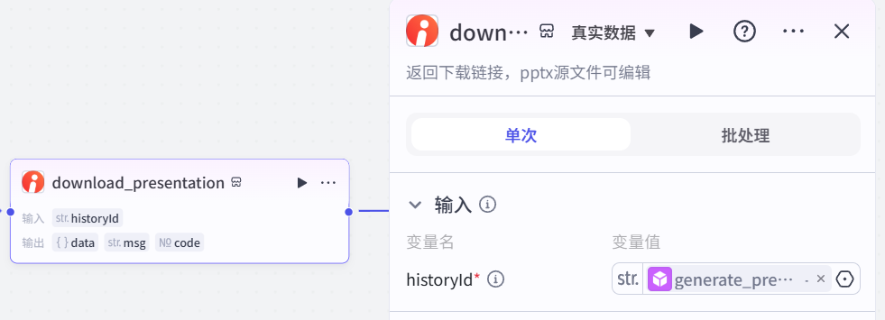 添加download_presentation,选择前一个结点的historyId作为变量值