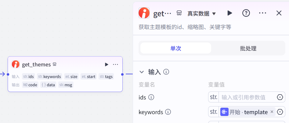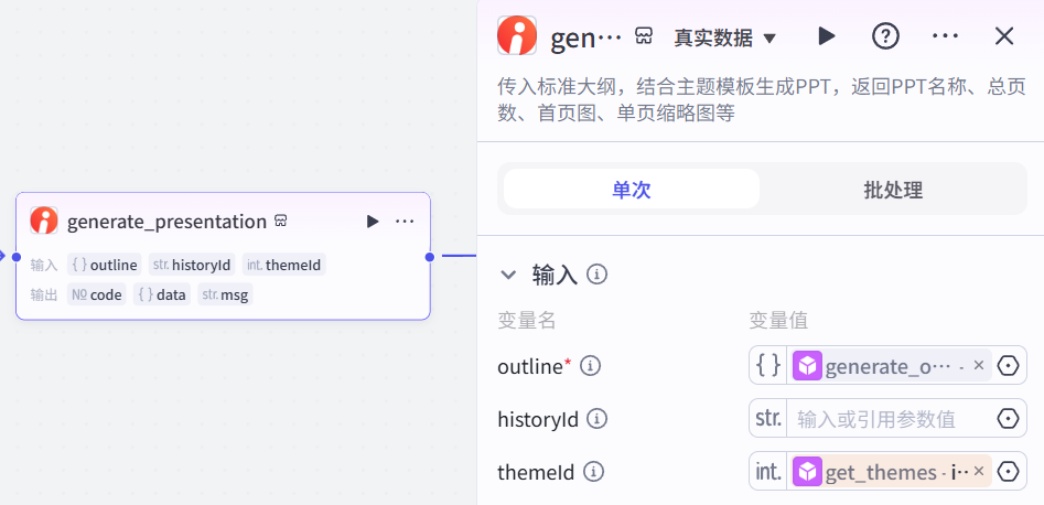 添加generate_presentation,选择generate_outline节点中的outline作为,第一个变量的变量值;选择get_themes节点中的id作为第三个变量的变量值
