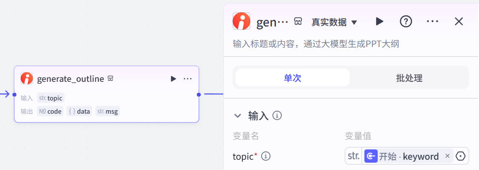 使用官方插件iSlide,添加generate_outline,选择开始节点的keyword为变量值