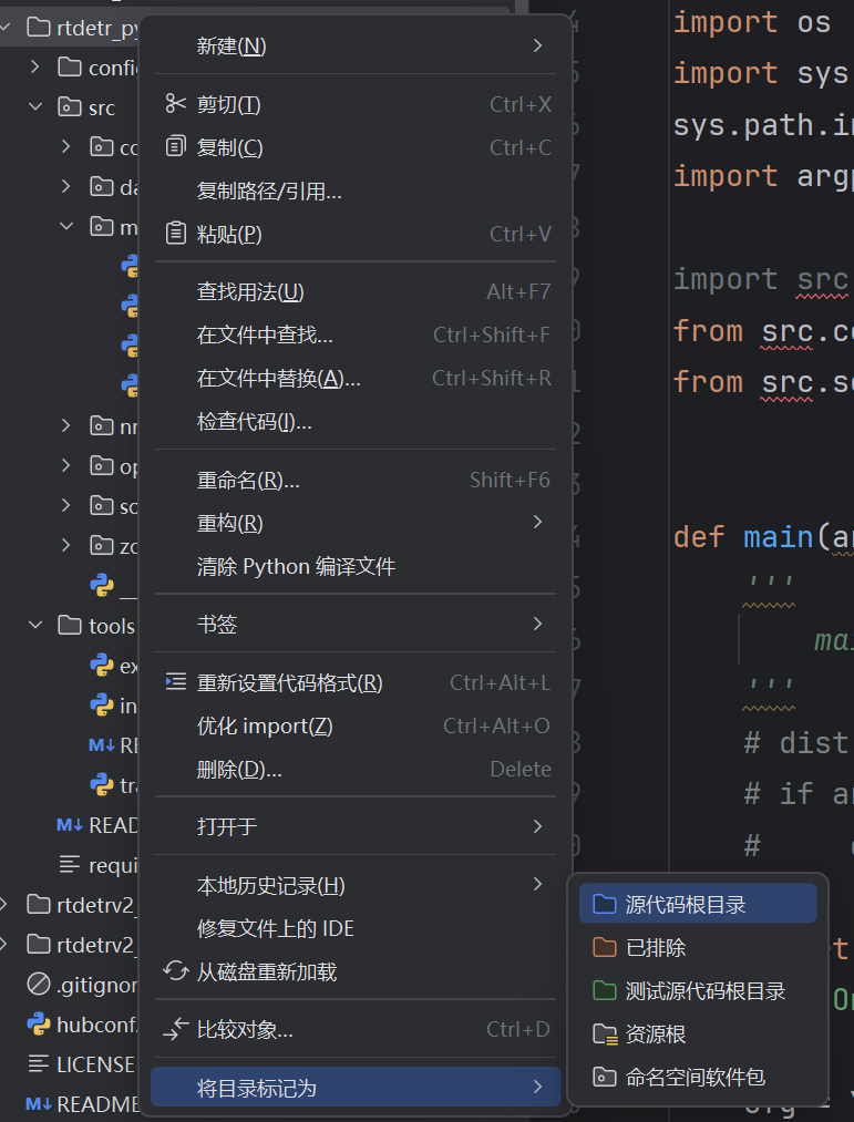 如果src标红,我们将rtdetr_pytorch目录标记为源代码根目录。