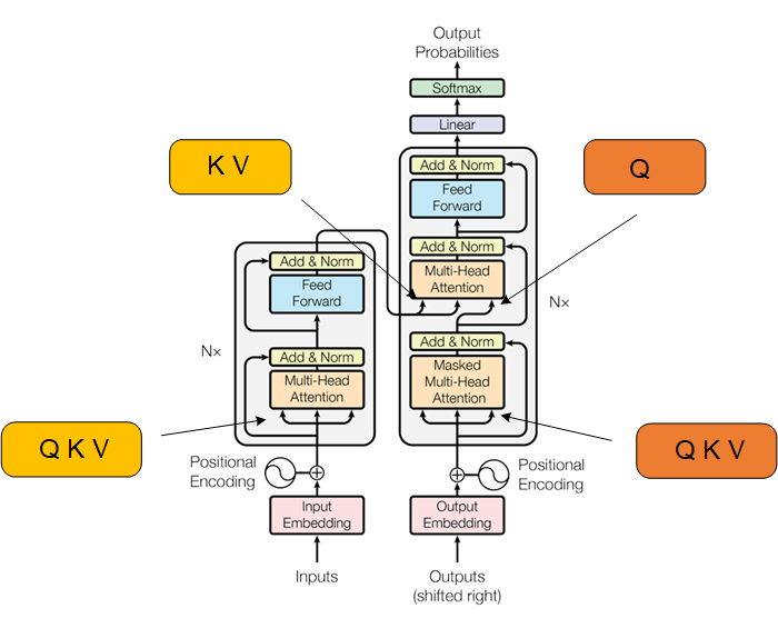 Encoder都是相同的注意力机制,而Decoder第二个注意力机制的K、V来自于Encoder,Q来自于上一层的输出。