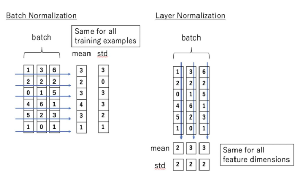 什么是归一化?针对一批数据归一化事实上就是计算出这批数据的均值和方差,然后数据减去均值再除以标准差(方差的开平方)。我们再来回忆一下层归一化是如何处理数据的,注意和Batch Norm进行区分。