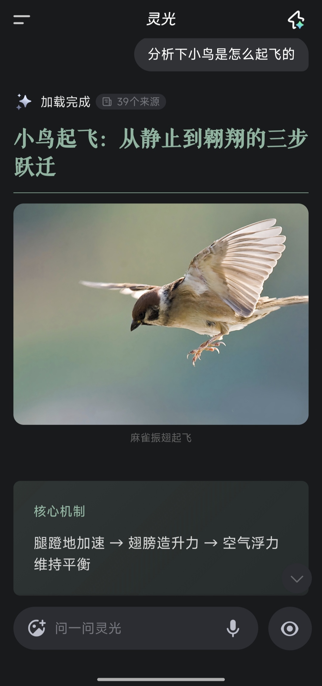 当你询问“小鸟是怎么起飞”时,它不会扔出一段冗长的文字,而是提供结构清晰、排版精美的回答,配有自动生成的头图和精美图标。