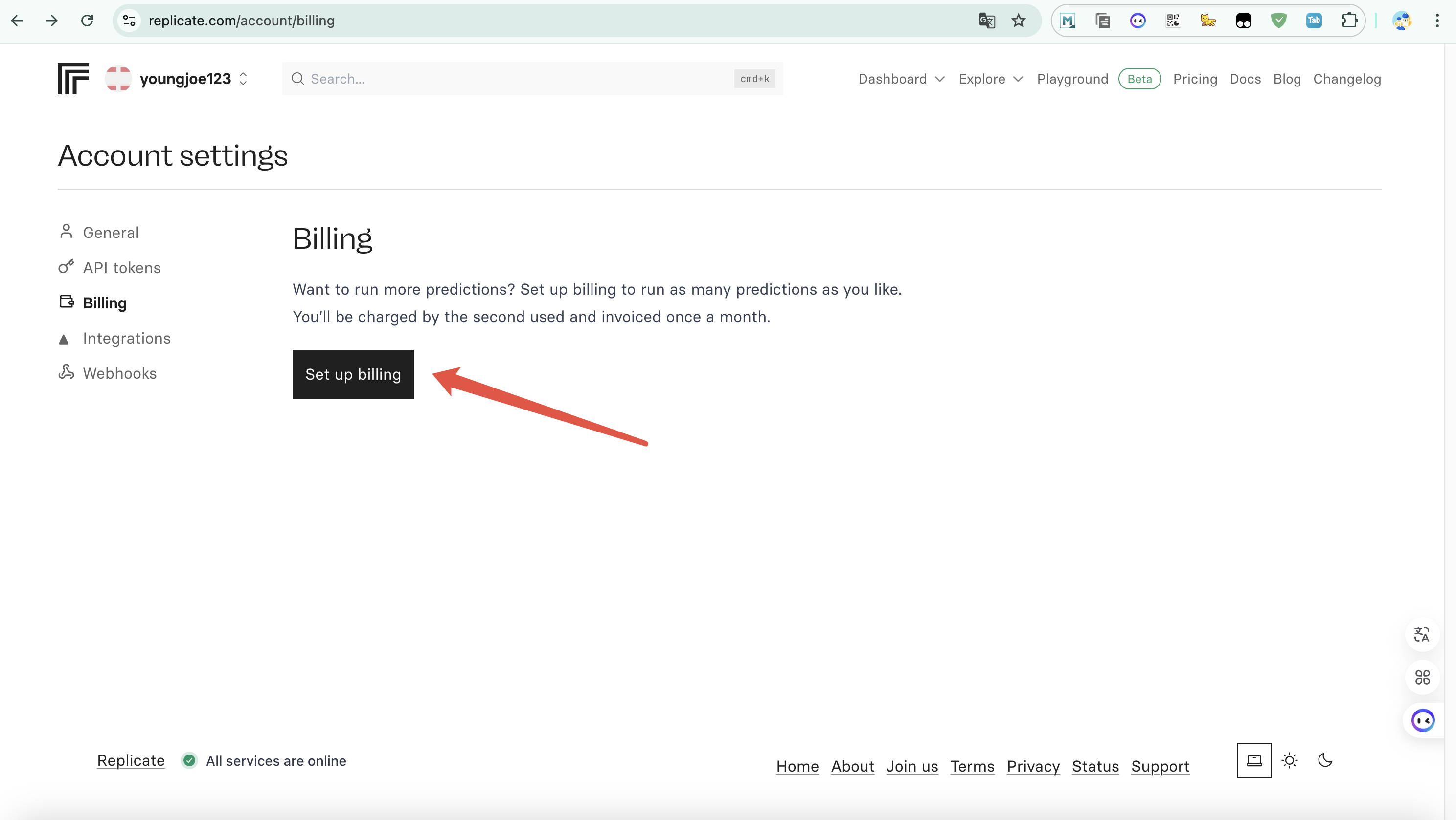 里面支持的模型很多,想要效果好点的可以使用高级模型,这里需要完成绑卡后才能生成API-Token,点击Set up billing