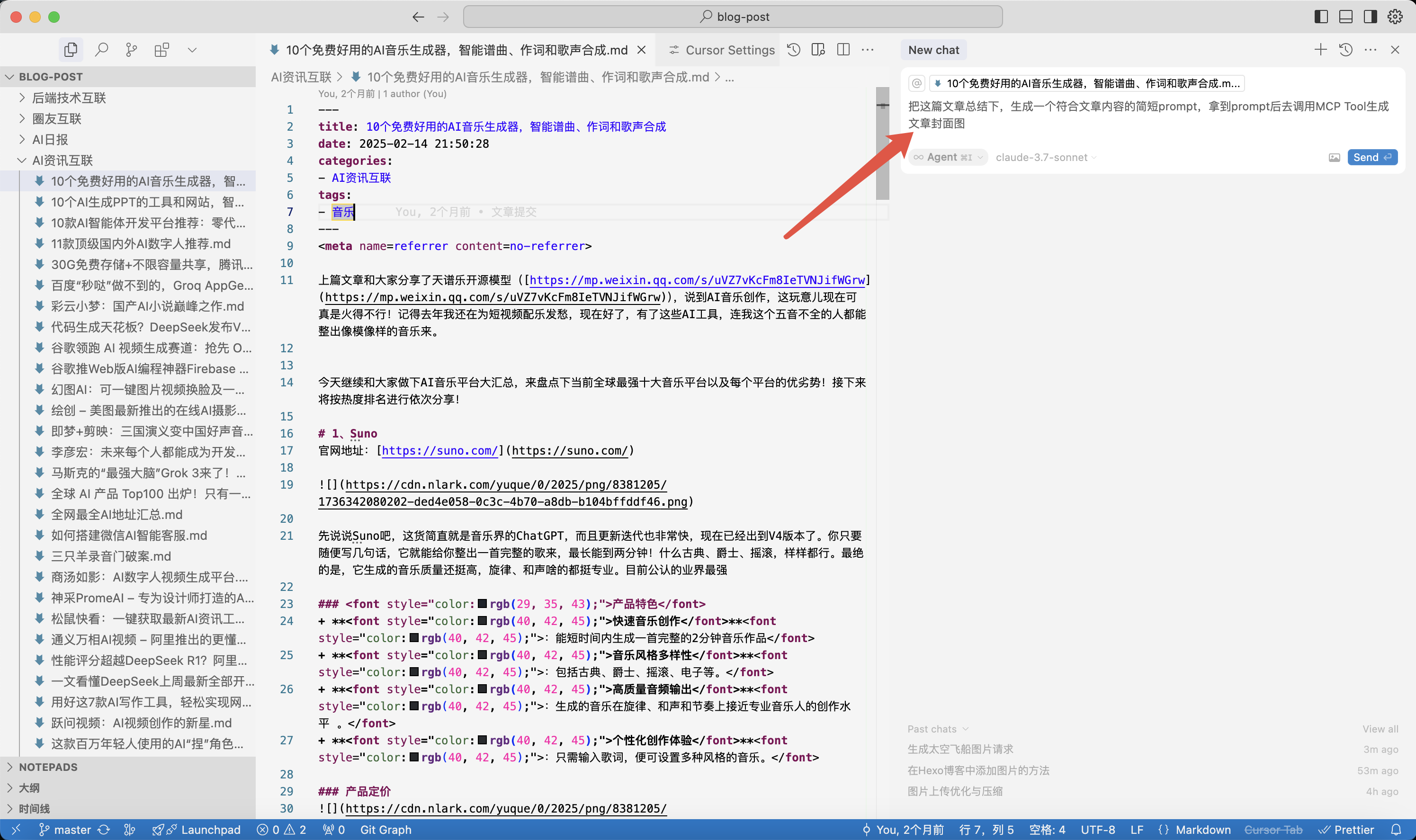 接下来,我们可以生成文章封面图了,选择整篇文章,对着输入:把这篇文章总结下,生成一个符合文章内容的简短prompt,拿到prompt后去调用MCP Tool生成文章封面图**(我这里选择Agent模式和Claude3.7模型)**