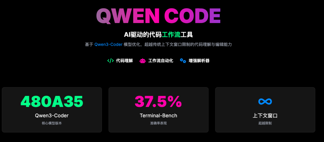 在Terminal-Bench基准测试中,Qwen Code搭载的Qwen3-Coder-480A35模型取得了37.5%的准确率,展现了出色的代码理解能力。Qwen Code不仅是开发者的好帮手,更是团队提升开发效率的利器。,是一款基于Qwen3-Coder模型优化的AI代码工作流工具,为开发者带来了全新的编码体验。:能够查询和编辑超出传统上下文窗口限制的大型代码库,让开发者可以轻松处理复杂的项