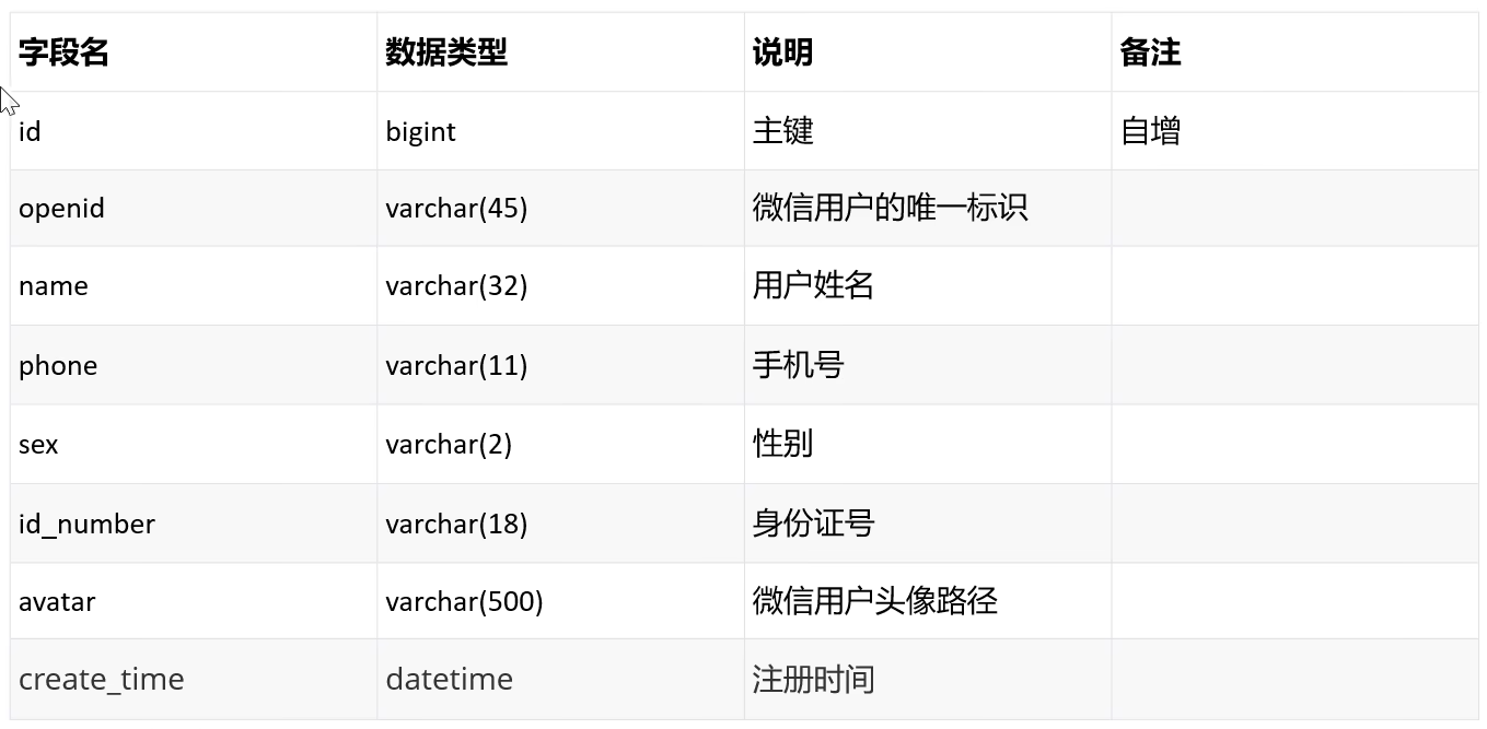 数据库设计(user表):