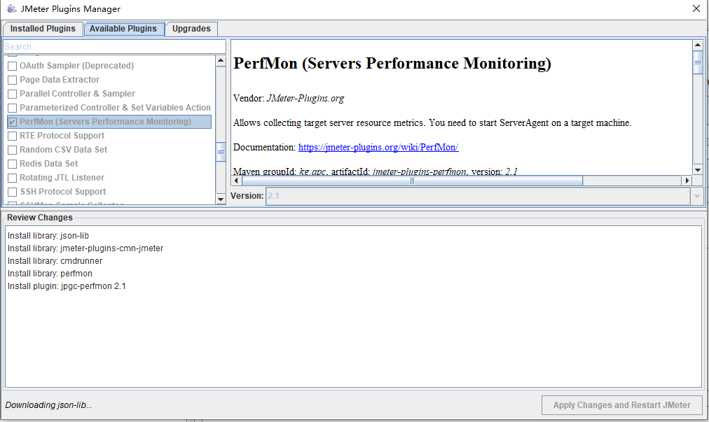 勾选该插件,然后点击 apply changs and Restart JMeter。成功重启后,打开JMeter。