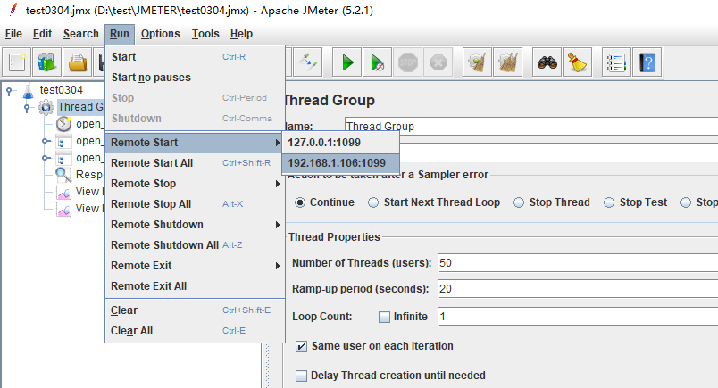 控制器启动JMeter。在run菜单中 找remote Start,如果有前面添加的主机,说明配置文件没有问题。
