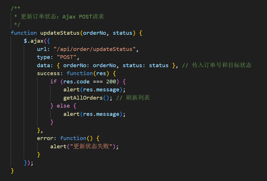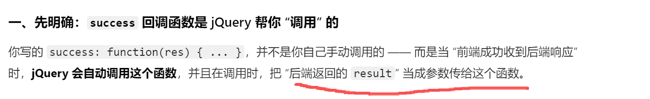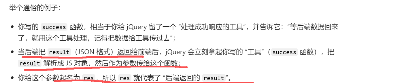 success: function(res) { ... } // 接收后端响应