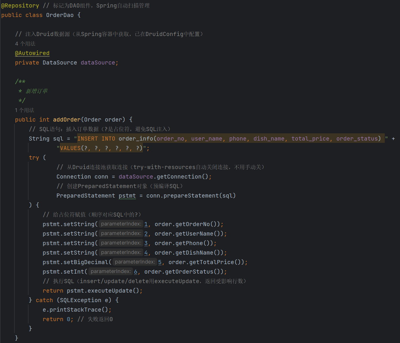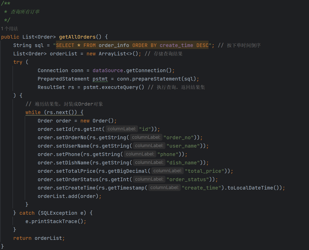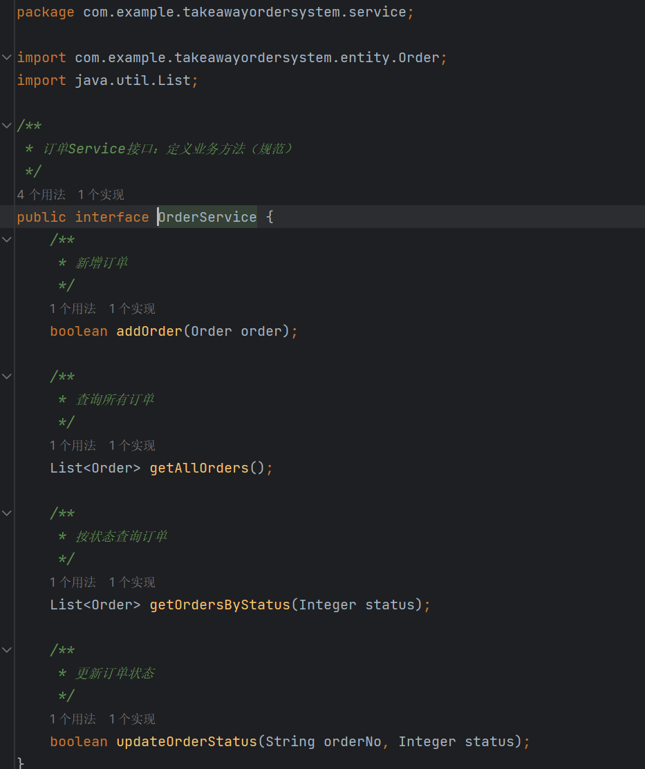 细心的盆友应该注意到我在具体的方法实现类里面有着刚刚没有提及到的类OrderDao类,这个类是具体执行sql语句的,我后来想了想,我觉得应该是先规定方法规范:“我要做什么”,再去想实际的方法内容:“我要怎么做”。