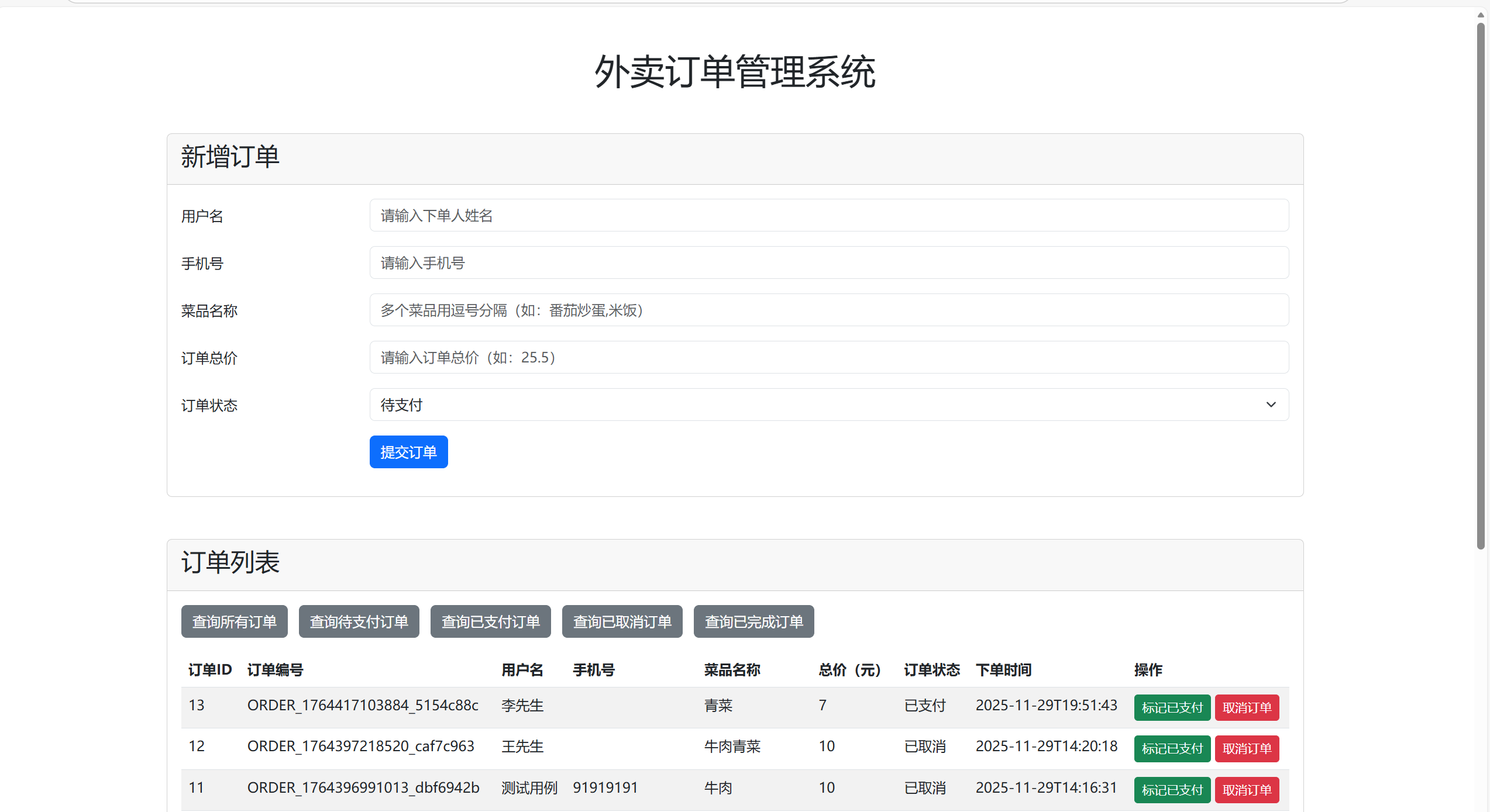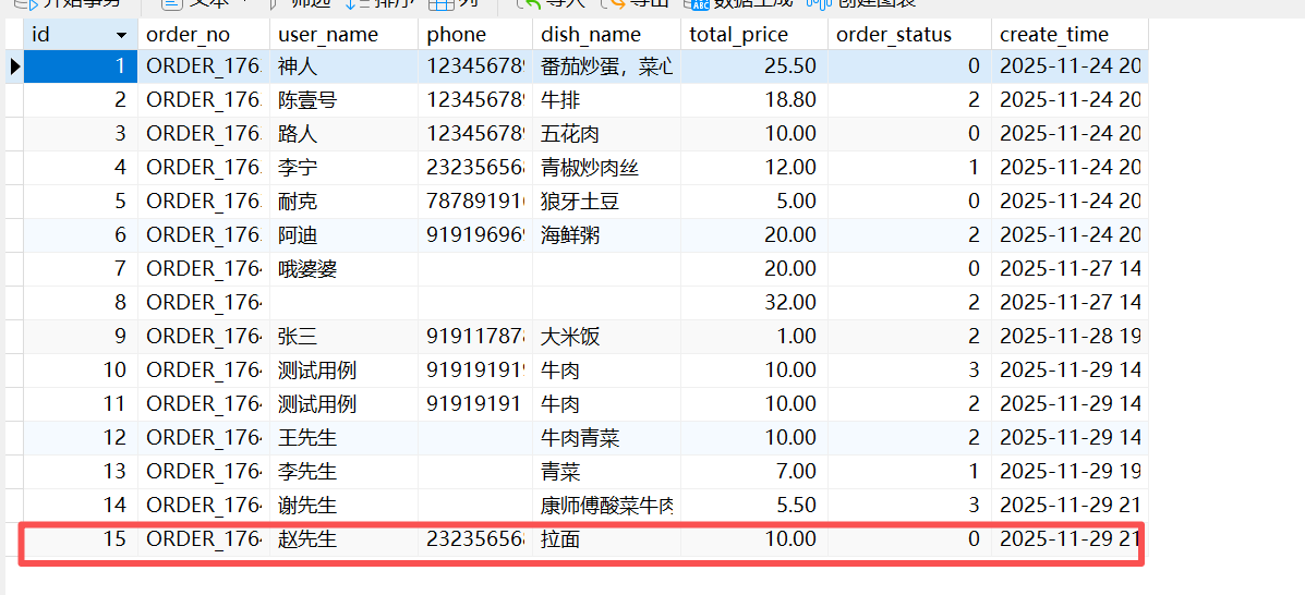 第三点需求:查询不同状态下的订单,其实和需求二一样,都是jdbc技术使用后端操控数据库(select where),然后把结果渲染给前端,这里不再过多赘述