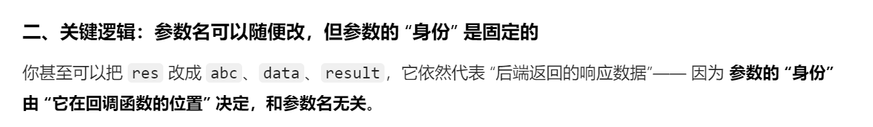 答:正是因为他是“成功回调”函数,请求发送成功那么后端就会返回值,后端返回的值是唯一的,那么这个res不就是后端唯一返回的result吗