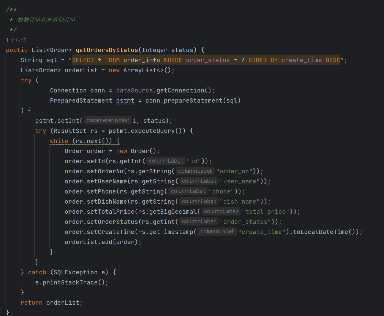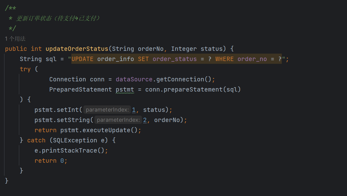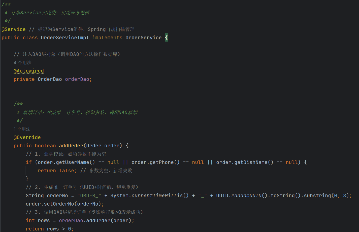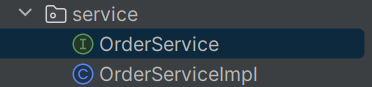 接着直接调用具体方法,这个具体方法其实就是我们第三步里面讲过的规范方法的接口的具体实现类的方法——orderservice类的方法,该类里面的方法结构在前文也讲述过了:逻辑判断+调用sql语句的方法