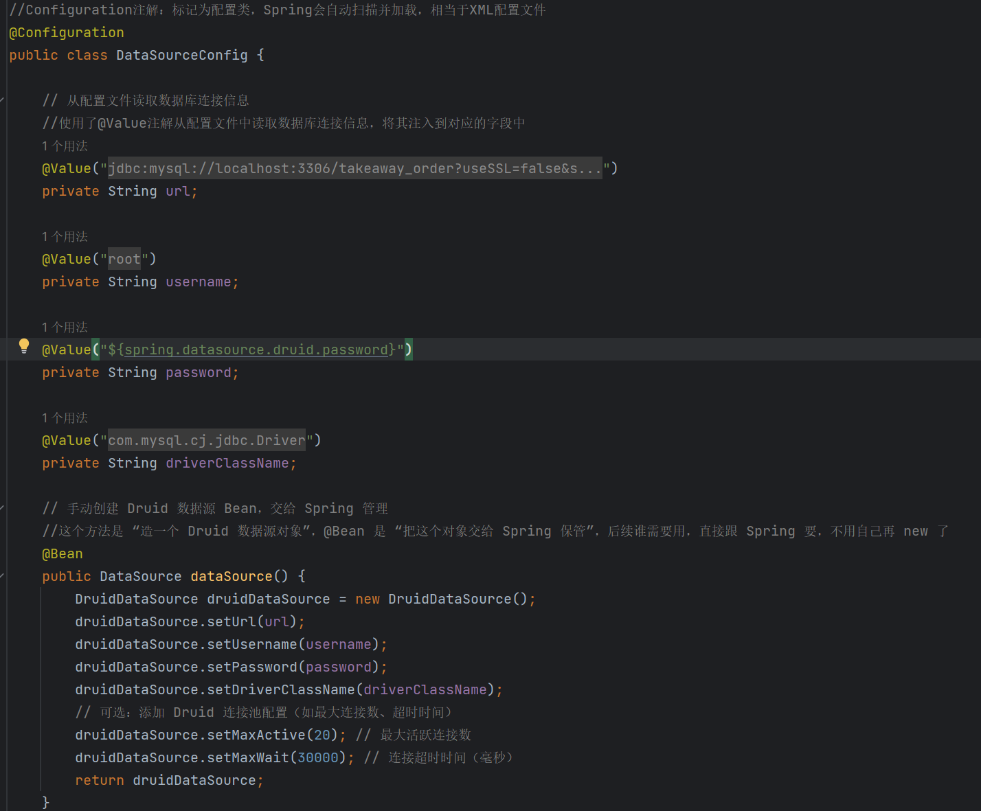 然后按照druid连接方式连接MySQL(我这里自动连接方式报错了,所以我新建了一个类直接手动连接)