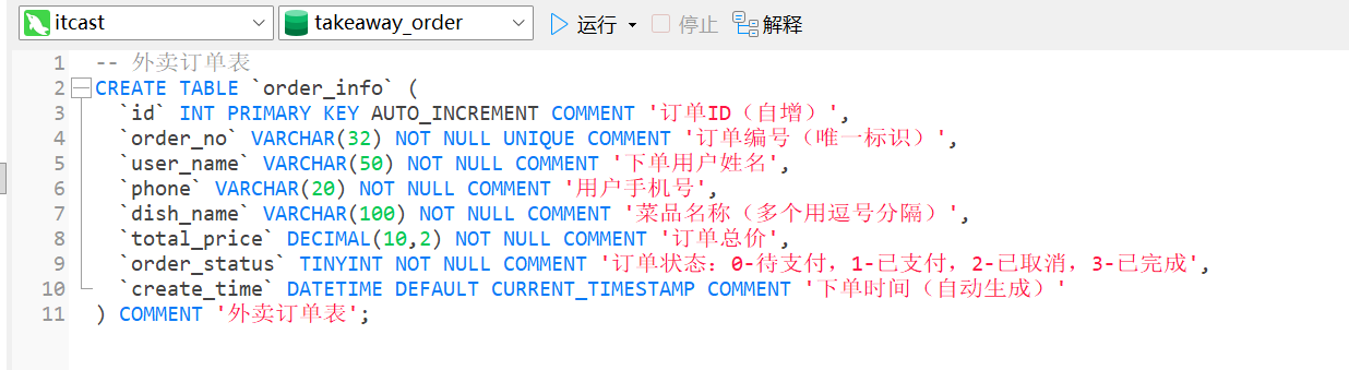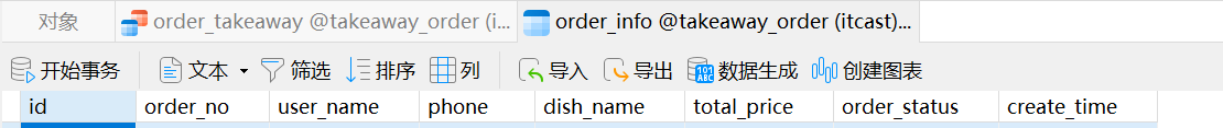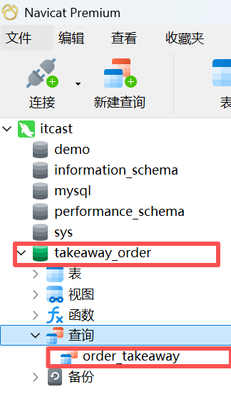 首先打开navicat,新建一个数据库takeway_order,然后新建查询来建立表格