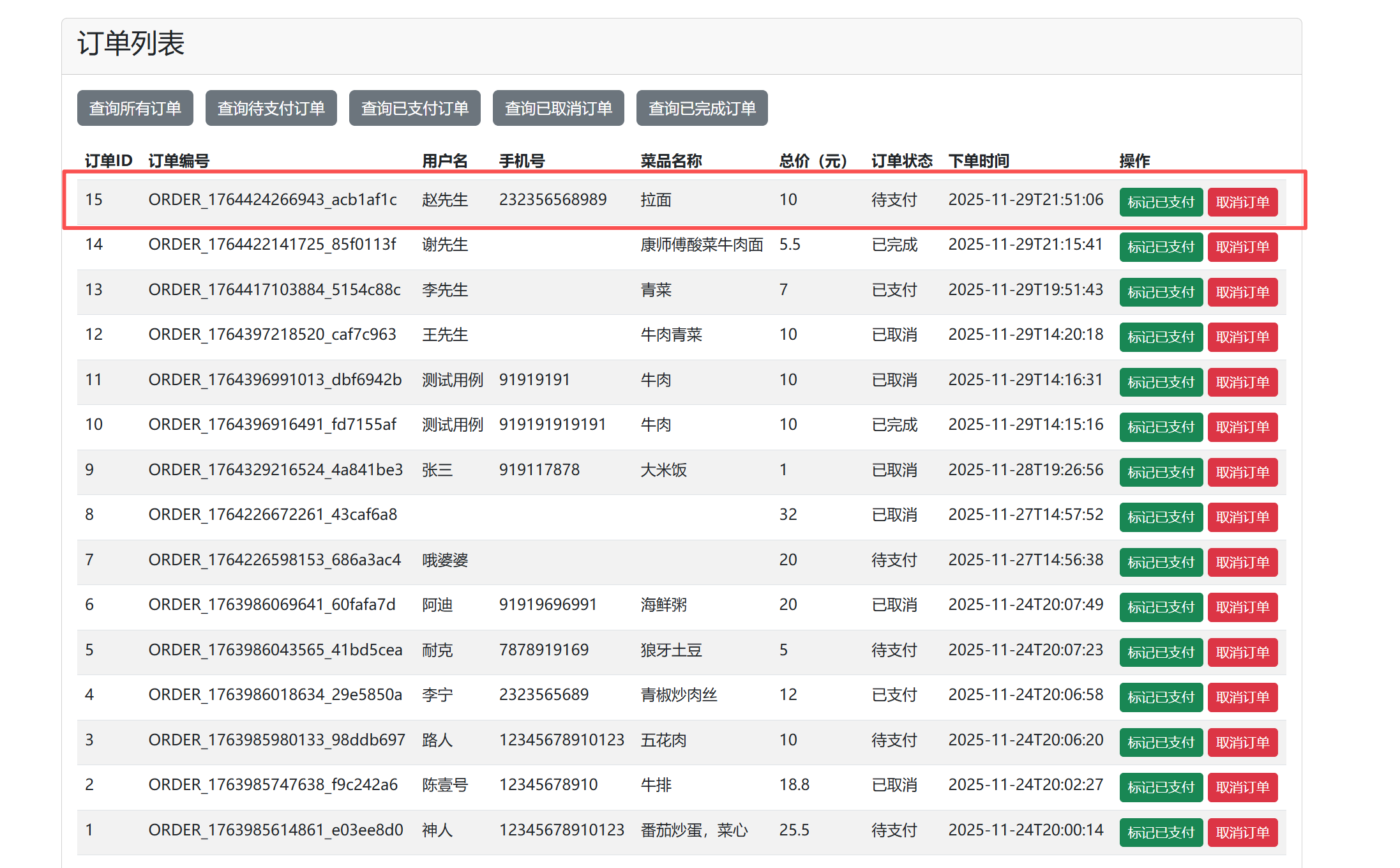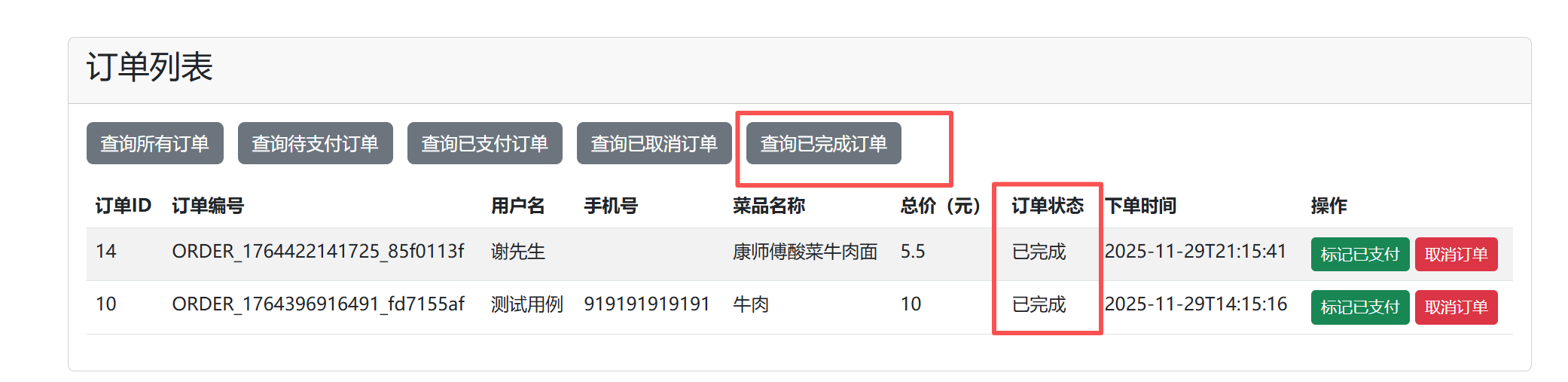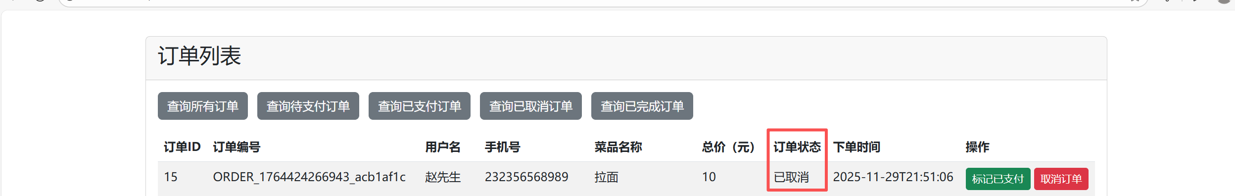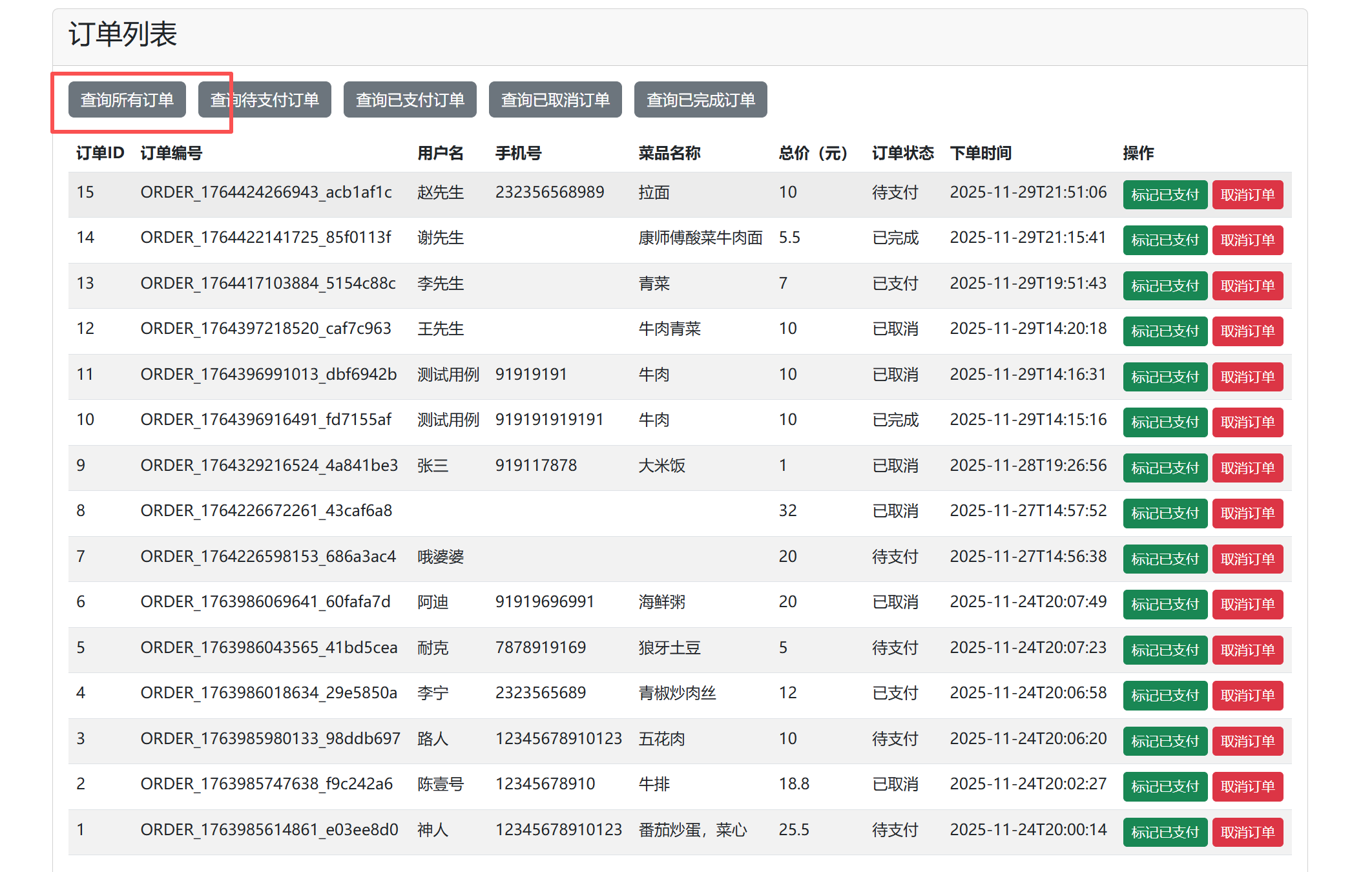 用户点击查询订单即可查询现有所有订单