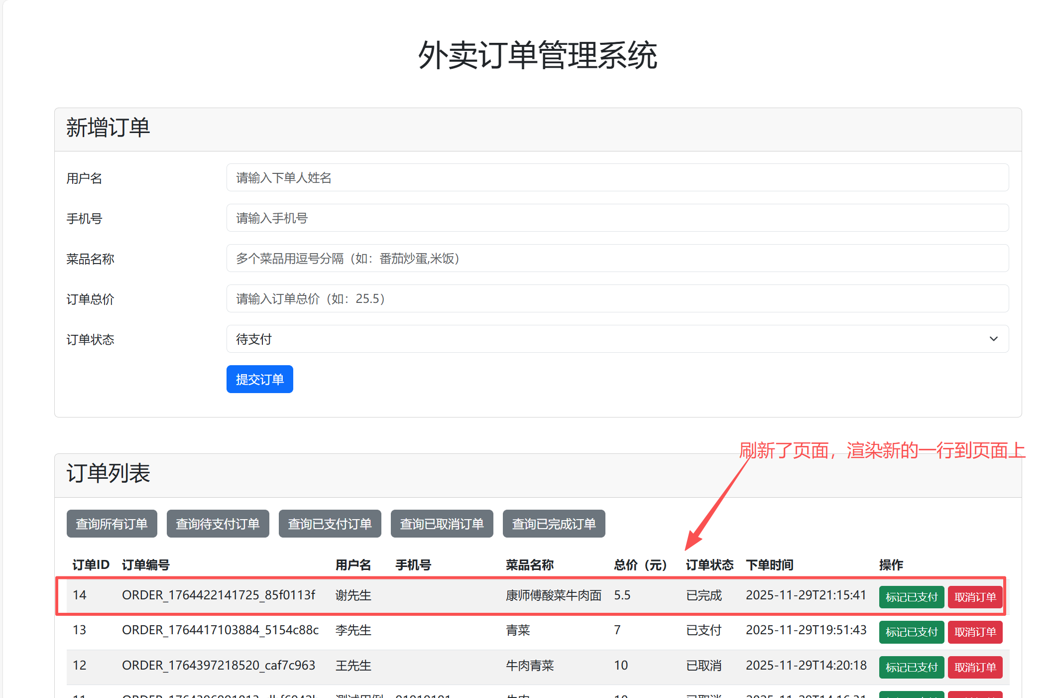 并且在下面渲染已有的订单,用户可以看到刚刚增加的订单以及过往的订单