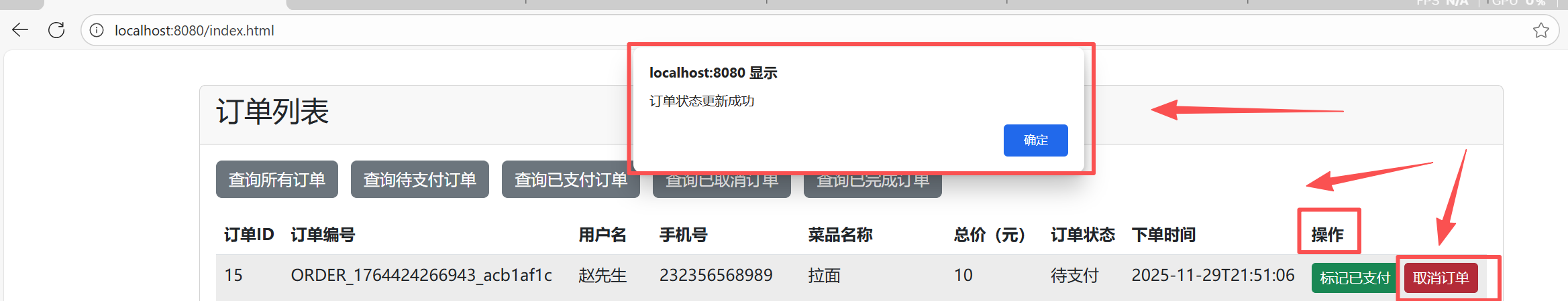 用户点击“操作”类型按钮即可修改订单状态,修改成功会有提示