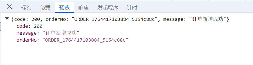 我们这里的需求是“新增订单”,对应的sql语句就是insert,jdbc在使用insert语句会返回受影响的行数,我们这里每次操作只会新增一条语句,因此我们可以根据insert的返回值是0或者1来判断insert语句是否执行成功,若逻辑错误(比如参数类型错误)即返回值为0,那么就会返回异常的请求状态码和请求数据,同理,若insert语句没问题就会返回正确的数据,最后这些数据都是被封装到result这个键值对里面的,由@RestController转换为json格式给前端