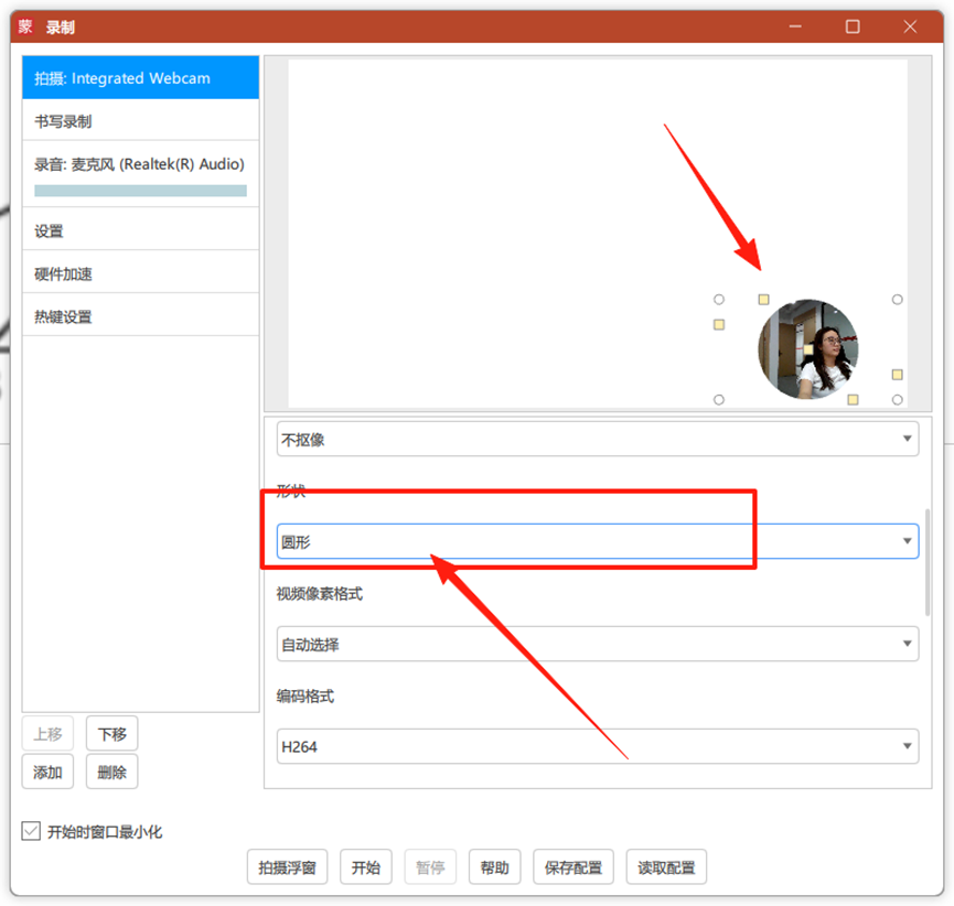 如果大家有人像出镜的需求的话,打开“书写+拍摄”功能就可以自动识别摄像头,把人像的大小和位置调好就可以点击 “开始”录制了。