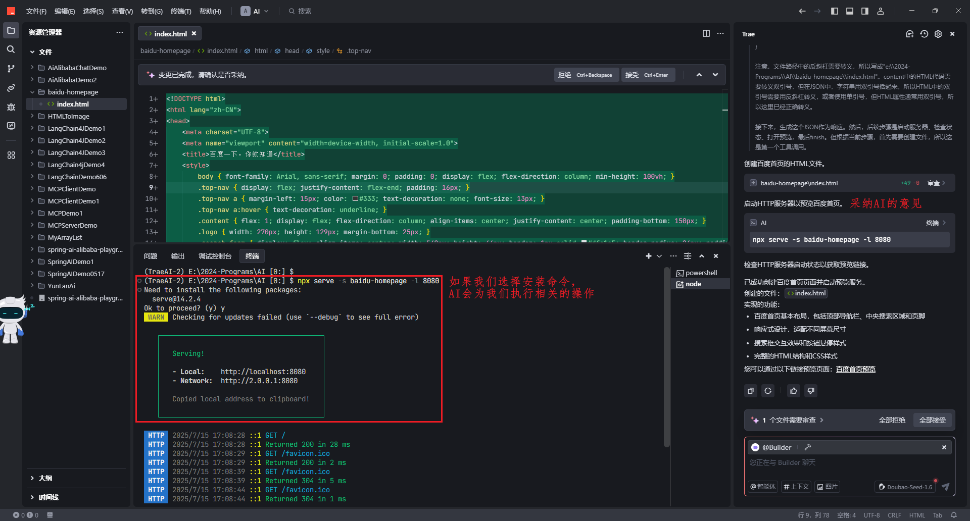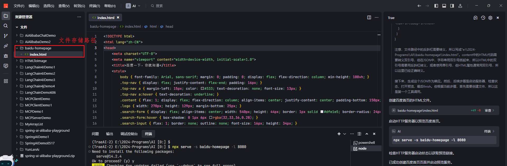 Agent 提醒我们去安装 npx 命令,并执行 npx server -s 进行预览
