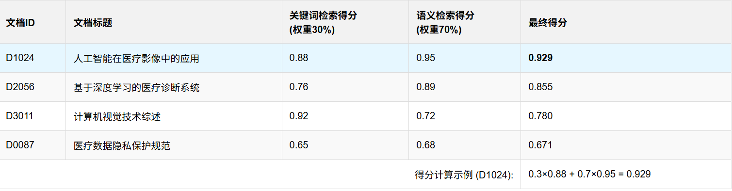 比如:最终得分 = 0.7 * 向量分数 + 0.3 * 关键词分数。