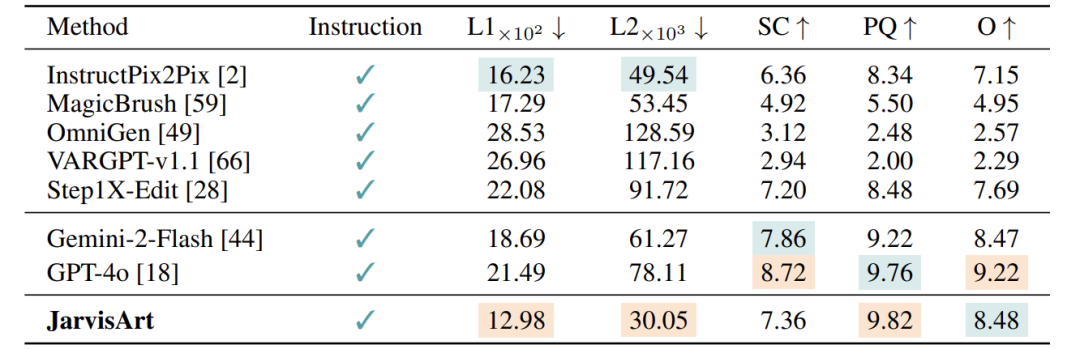 数据:JarvisArt在L1/L2等像素指标显著领先,指令跟随性媲美GPT-4o