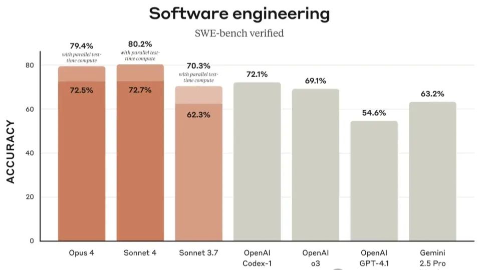 Claude Opus 4被官方称为"世界最强编程模型",在权威的SWE-bench测试中拿下了72.5%的成绩,超越了OpenAI的o3(69.1%)和谷歌的Gemini 2.5 Pro(63.2%)(上图)